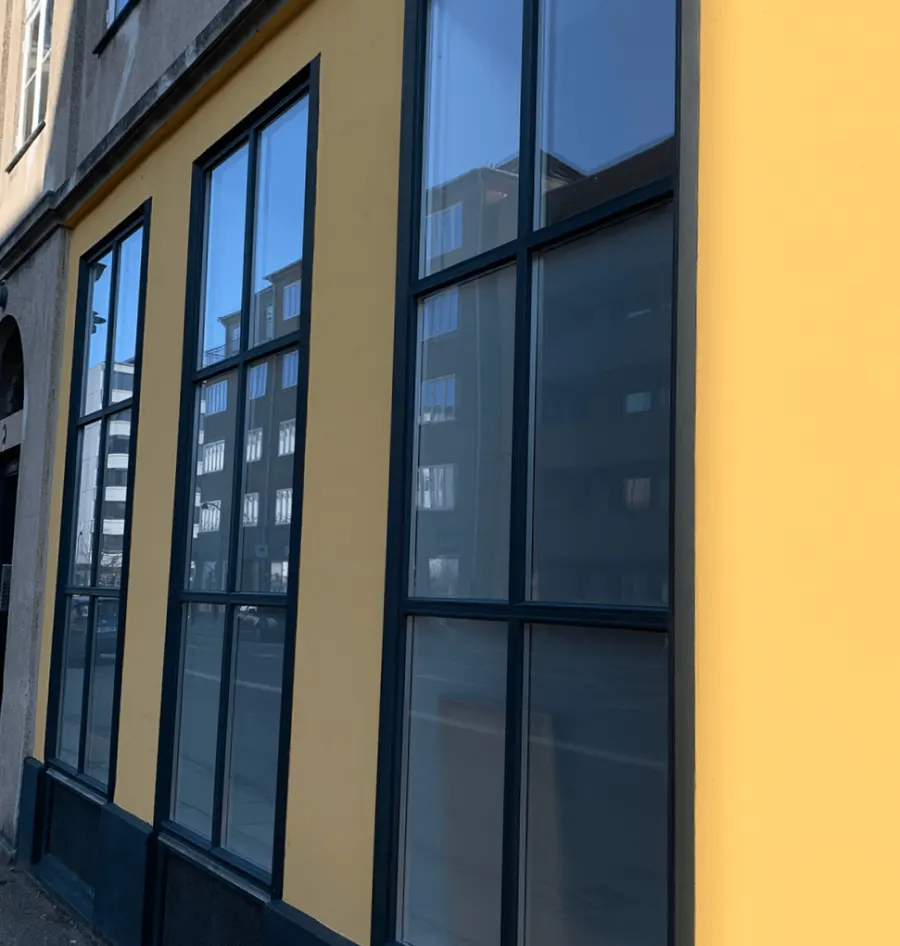 Det lidt særpræget bygnings- og materialevalg gør sig også gældende ifm. ejendommens vinduer. De nuværende vinduer i ejendommen adskiller sig nemlig fra, hvad man typisk møder ved en vinduesudskiftning. Alle vinduerne mod gaden har forskellige mål, hvilket har betydet, at de er blevet opmålt på ny for at sikre de korrekte størrelser og mål. De gamle vinduer, som har udtjent deres værnepligt, bliver derfor udskiftet med nye Idealcombi IC Nation 2-lagsvinduer med lydglas, som produceres efter specielle mål. De nye vinduer er mere isoleringsdygtige og medvirker samtidig til at nedsætte støjniveauet fra gadetrafikken.